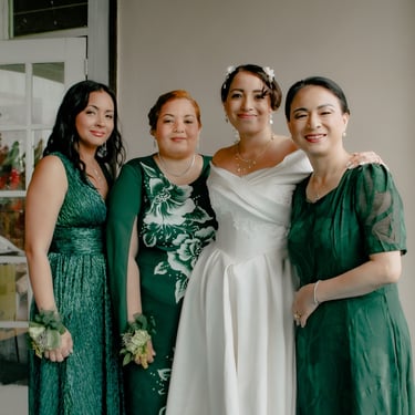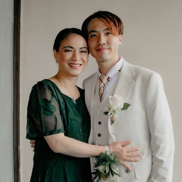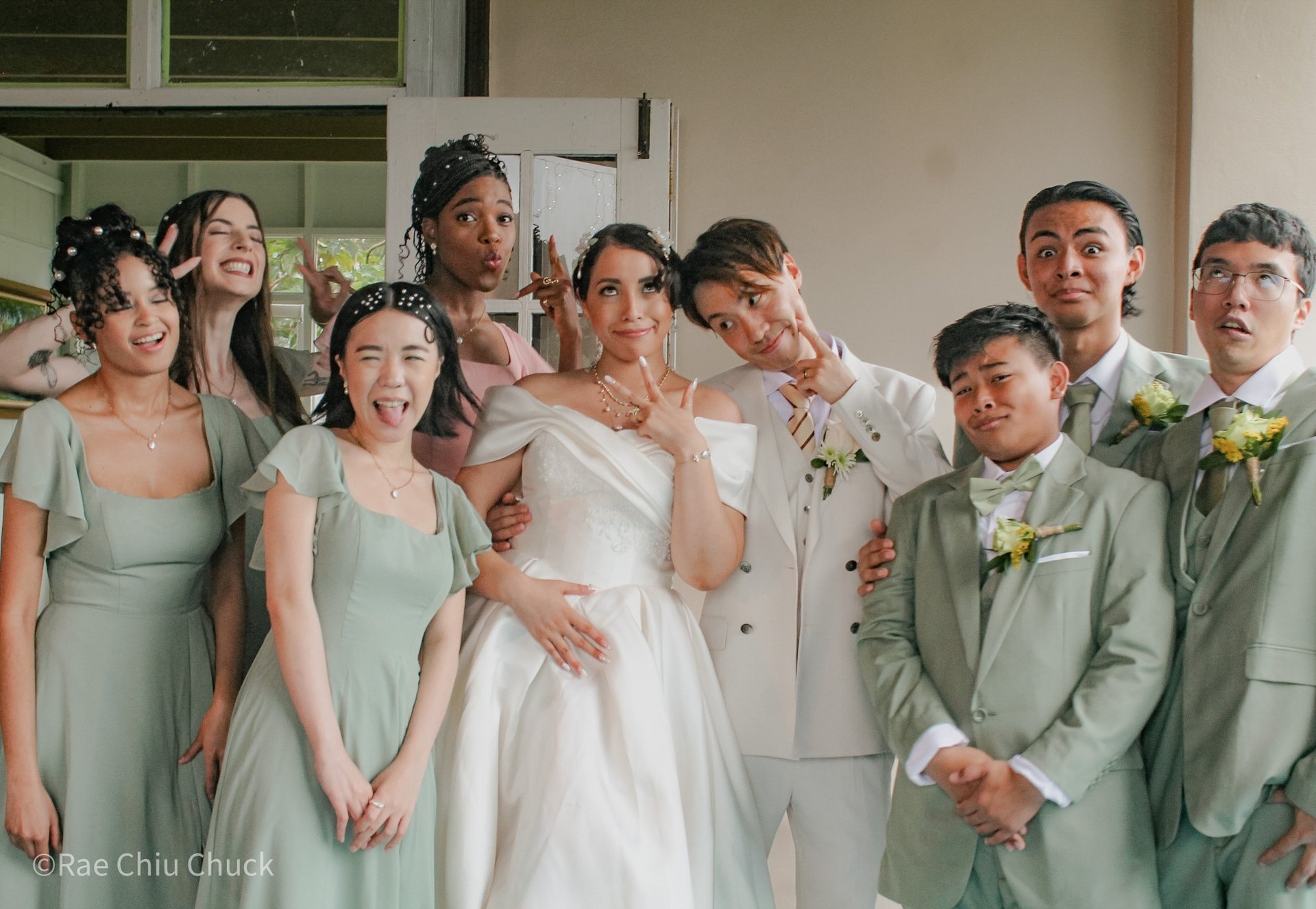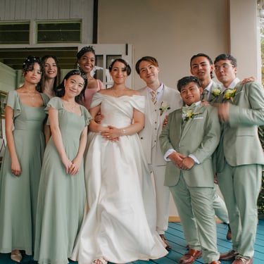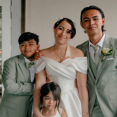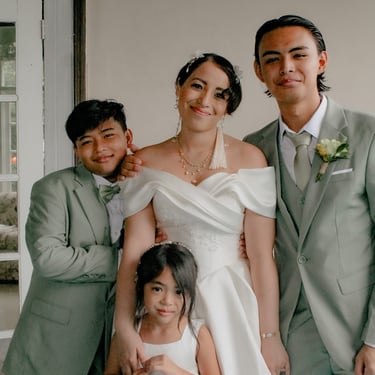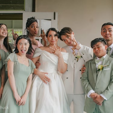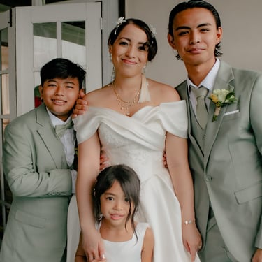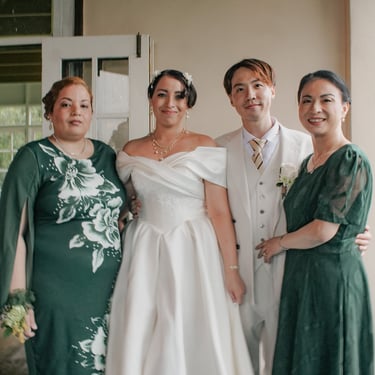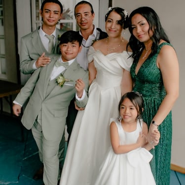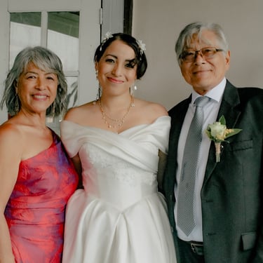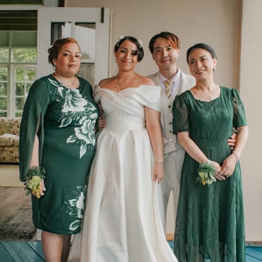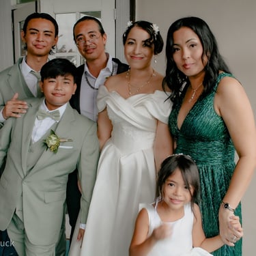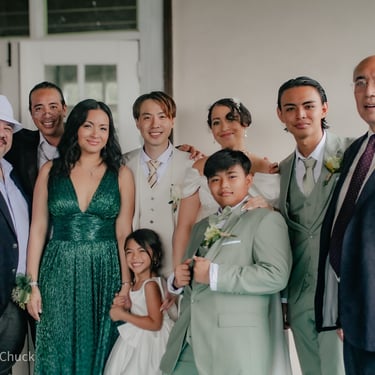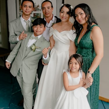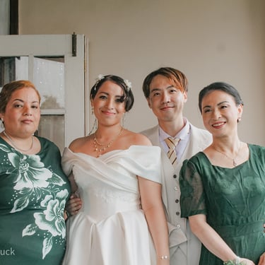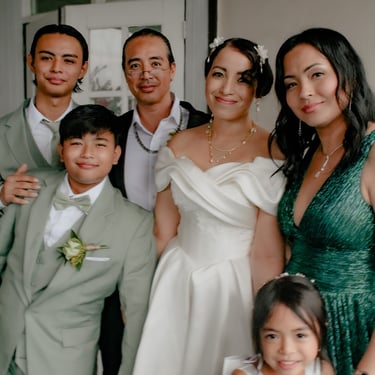 After the ceremony, we tried to get some traditional photos in, but it was not easy. We scrunched up together on the porch, anyone standing on the right side was getting soaked. Kai's curls long-gone already. Rae couldn't wait to get away, and much of the close family wasn't around because the rain divided the house from the reception seating. We're missing all of (Rae's) Mom's side, and Aunty Sharon, close cousins-- Usually moments like these when we are all together are great for memorable group shots but it didn't happen this time. Still, grateful for the memories we were able to capture.