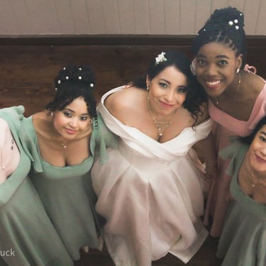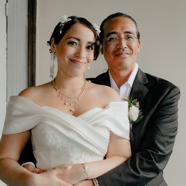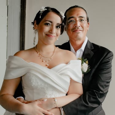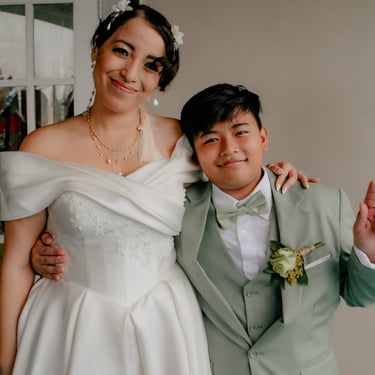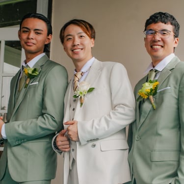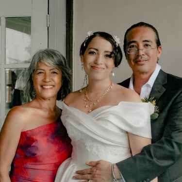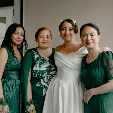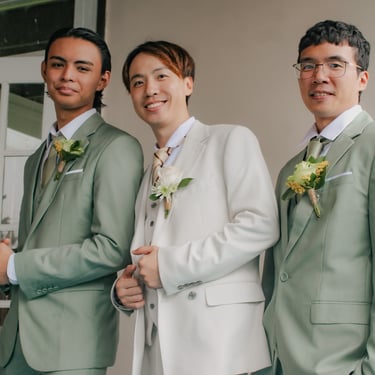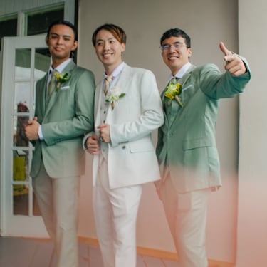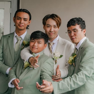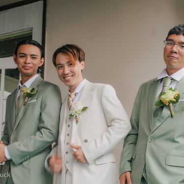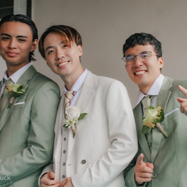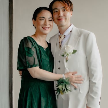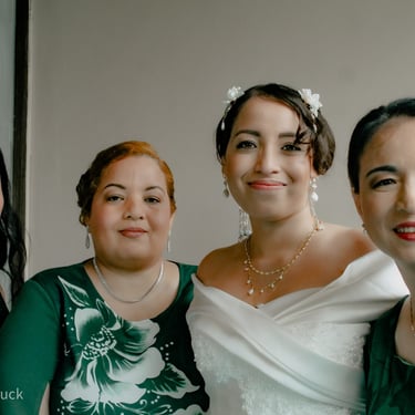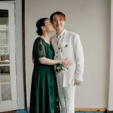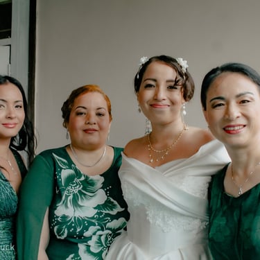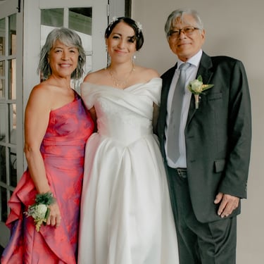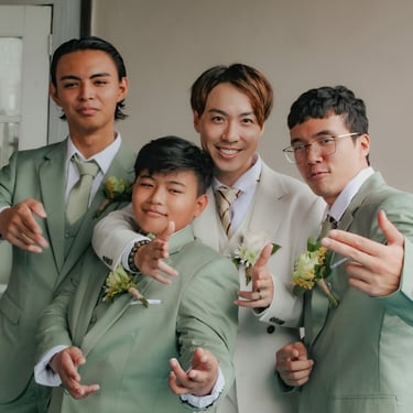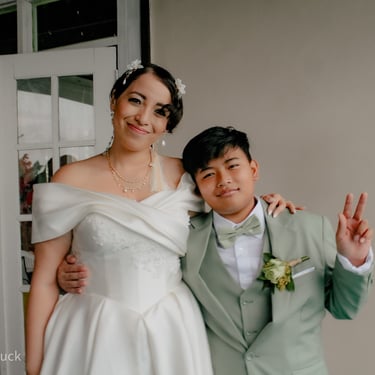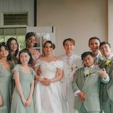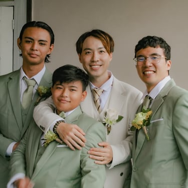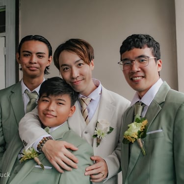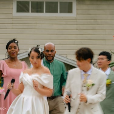 After the ceremony, we tried to get some traditional photos in, but it was not easy. We scrunched up together on the porch, anyone standing on the right side was getting soaked. Kai's curls long-gone already. Rae couldn't wait to get away, and much of the close family wasn't around because the rain divided the house from the reception seating. We're missing all of (Rae's) Mom's side, and Aunty Sharon, close cousins-- Usually moments like these when we are all together are great for memorable group shots but it didn't happen this time. Still, grateful for the memories we were able to capture.